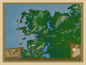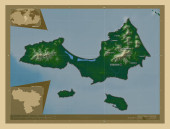 Mangghystau, region Kazachstanu. Kolorowa mapa wzniesień z jeziorami i rzekami. Lokalizacje i nazwy głównych miast regionu. Pomocnicze mapy położenia narożnika