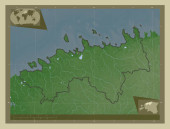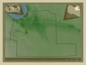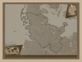 Mangghystau, region Kazachstanu. Mapa elewacji kolorowe w sepia dźwięki z jeziorami i rzekami. Pomocnicze mapy położenia narożnika