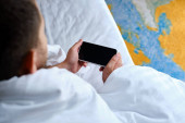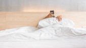 Mężczyzna trzyma smartfona w łóżku i sprawdza konto w sieci społecznościowej przed pójściem spać lub po przebudzeniu. Uzależnienie od gadżetów. Człowiek wysyłający SMS-a na komórkę