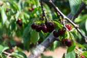 Jagody czereśni, wiszące na drzewie wiśniowym w sadach owocowych w czerwcu, w pobliżu wioski Venasque, Luberon, Francja