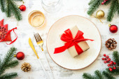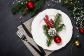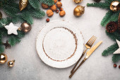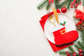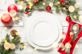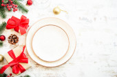 Świąteczne jedzenie, świąteczne nakrycie stołu z białym talerzem, złote sztućce i ozdoby świąteczne na białym drewnianym tle. Widok z góry z miejsca kopiowania.