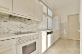 Zdjęcie "Współczesne szafki z urządzeń i stołów z naczyniami kuchennymi znajduje się w jasnej kuchni w pobliżu jadalni w stylowym apartamencie" może być wykorzystywane do celów osobistych i komercyjnych zgodnie z warunkami zakupionej licencji Royalty-free. Obraz jest dostępny do pobrania w jakości wysokiej rozdzielczości do 5760x3840.