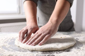 Kobieta ugniatająca ciasto przy stole w kuchni, zbliżenie