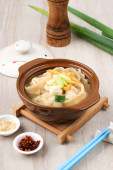 Tteokguk, koreańska zupa ryżowa w plasterkach, owalne ciasto ryżowe ugotowane w bulionie. Tradycyjne księżycowe danie noworoczne. Clear Beef bulion jest najczęściej używane