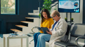 Zdjęcie "Różnorodni ludzie rozmawiający o diagnostyce wyników rentgenowskich w holu placówki, robiący wizyty kontrolne. Patrzę na radiografię kości po badaniu ortopedycznym w poczekalni. Strzał ręczny." może być wykorzystywane do celów osobistych i komercyjnych zgodnie z warunkami zakupionej licencji Royalty-free. Obraz jest dostępny do pobrania w jakości wysokiej rozdzielczości do 5760x3840.