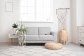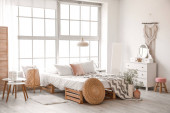 Zdjęcie "Wnętrze jasnej sypialni z drewnianą deską surfingową, bankietem i regałami" może być wykorzystywane do celów osobistych i komercyjnych zgodnie z warunkami zakupionej licencji Royalty-free. Obraz jest dostępny do pobrania w jakości wysokiej rozdzielczości do 5760x3840.