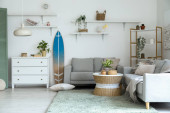 Wnętrze jasnej sypialni z drewnianą deską surfingową, bankietem i regałami