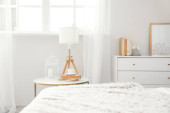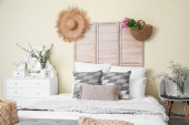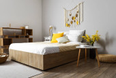 Zdjęcie "Wnętrze nowoczesnego pokoju z dużym łóżkiem" może być wykorzystywane do celów osobistych i komercyjnych zgodnie z warunkami zakupionej licencji Royalty-free. Obraz jest dostępny do pobrania w jakości wysokiej rozdzielczości do 5760x3840.