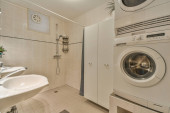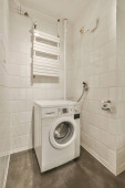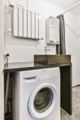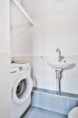 Zdjęcie "Szafka z umywalką i lustrem przymocowana do ściany w pobliżu drzwi i regału suszącego w nowoczesnej toalecie" może być wykorzystywane do celów osobistych i komercyjnych zgodnie z warunkami zakupionej licencji Royalty-free. Obraz jest dostępny do pobrania w jakości wysokiej rozdzielczości do 5760x3840.