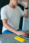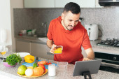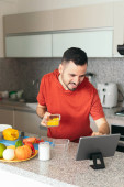 Młody człowiek rozmawia przez telefon podczas przygotowywania śniadania w domu