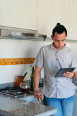 Zdjęcie "Młody człowiek rozmawia przez telefon podczas przygotowywania śniadania w domu" może być wykorzystywane do celów osobistych i komercyjnych zgodnie z warunkami zakupionej licencji Royalty-free. Obraz jest dostępny do pobrania w jakości wysokiej rozdzielczości do 5760x3840.