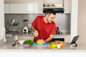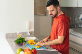 mężczyzna sieka warzywa na desce do krojenia podczas przygotowywania zdrowego posiłku w kuchni w domu
