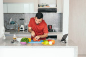 Zdjęcie "mężczyzna sieka warzywa na desce do krojenia podczas przygotowywania zdrowego posiłku w kuchni w domu" może być wykorzystywane do celów osobistych i komercyjnych zgodnie z warunkami zakupionej licencji Royalty-free. Obraz jest dostępny do pobrania w jakości wysokiej rozdzielczości do 5760x3840.