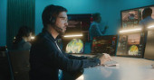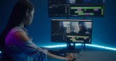 Dziewczyna pracuje z wieloma monitorami komputerowymi. Noszenie zestawu słuchawkowego z programowaniem świateł LED na komputerze. Kodowanie. Plecione włosy dziewczyna w stylu cyberpunk.