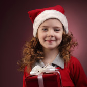 Szczęśliwy uśmiechnięty dziecko w stroju casual i Boże Narodzenie kapelusz z pudełkami w świątecznym opakowaniu. Dziewczyna raduje się z wakacji. Wesołych Świąt, Nowy Rok. Koncepcja emocji, marzeń, szczęśliwego dzieciństwa, życzeń
