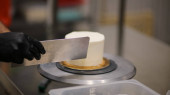 kucharz robi dla oblodzenia liliowy kroplówka ciasto w profesjonalnym laboratorium kuchni