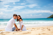 szczęśliwa para w okulary przeciwsłoneczne na plaży