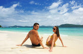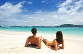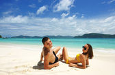 szczęśliwa para w okulary przeciwsłoneczne na plaży