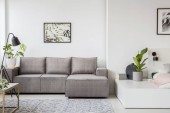 Wnętrze jasnego salonu z szarymi sofami, stołem i regałami
