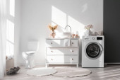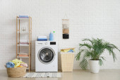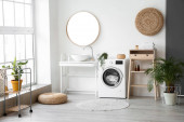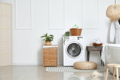 Interior of light laundry room with washing machine, shelving unit and houseplants
