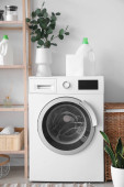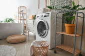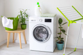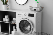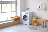 Wnętrze jasnej pralni z pralką, licznikami i koszem