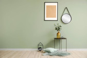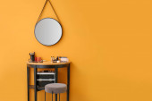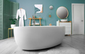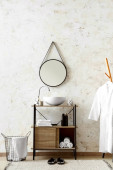 Wnętrze stylowej łazienki z lustrem, regałami i regałami
