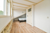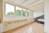Lekki, wąski korytarz z wieloma drzwiami w białych ścianach i świecącą lampą nad podłogą z drewna