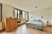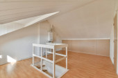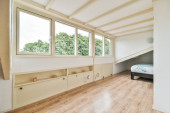 Łóżko umieszczone w pobliżu ściany w nowoczesnym minimalistycznym stylu mansard sypialnia z oknami