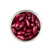 Czerwona fasola nerki, w otwartej puszce. Gotowane i puszkowane fasoli zwyczajnej nerki, różne fasoli pospolitej, Phaseolus vulgaris, wegetariańskie zszywki żywności. izolowane, z góry, zbliżenie, makro jedzenie zdjęcie.