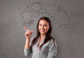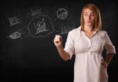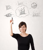 Ładna dziewczyna szkicuje wykresy i diagramy na ścianie