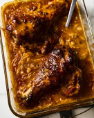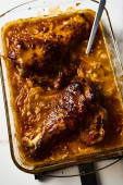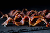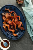 Widok z góry na dół smażone kandyzowane marchewki na patelni z szynką wędzoną w szklance na patelni obok.