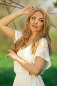Piękna młoda blond kobieta wiosną w ciepły słoneczny dzień