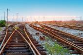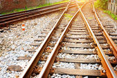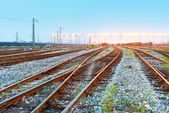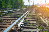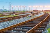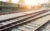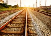 Platforma pociągu towarowego o zachodzie słońca z kontenerem
