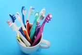 kolorowe szczoteczka do zębów w szklance na zielonym tle