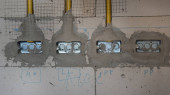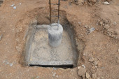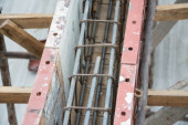 Prostokątny pręt zbrojeniowy jest punktem przyłączeniowym do wzmocnienia wytrzymałości konstrukcji. Umieścić stalowe kolumny ramy na cementowej podłodze. Budowa fundamentu domu.