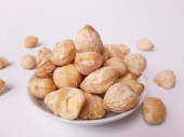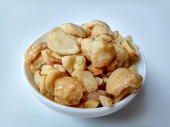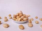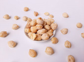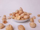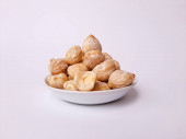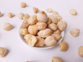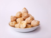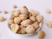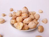 Aleurity moluccanus lub indonezyjskie świece zwane Kemiri, wewnątrz talerza smale, izolowane w białym tle