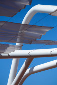 Świecące żółte linie na tętniącym życiem błękitnym niebie z wyłączoną lampą uliczną, Braga, Portugalia.