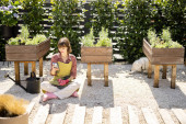 Zdjęcie "Młoda kobieta kwiaciarnia spacery z doniczek, dbanie o rośliny na pięknym podwórku z szklarni. Hobby, koncepcja uprawy roślin" może być wykorzystywane do celów osobistych i komercyjnych zgodnie z warunkami zakupionej licencji Royalty-free. Obraz jest dostępny do pobrania w jakości wysokiej rozdzielczości do 5760x3840.