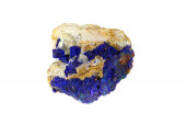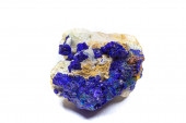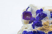 Makro głęboki niebieski azuryt gromada kryształów na białej matrycy izolowany kryształ na białym tle