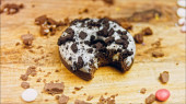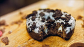 Pączek ma ugryzienie w kształcie ust. Czekoladowe pączki ozdobione kawałkami herbatników oreo. Pączki są na papierze ozdobionym naturalną czekoladą. Strzelanie makro i suwakiem. Koncepcja piekarnicza i spożywcza