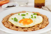 White kidney beans with egg and potato. Cooked cannellini bean pile, baked legume, yellow beans breakfast on white plate