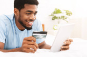 Zdjęcie "Płatność internetowa. Szczęśliwy wesoły człowiek patrząc na ekranie laptopa podczas dokonywania płatności internetowych. Szczęśliwy młody człowiek z kartą kredytową i laptopem siedzący na kanapie w domu. Płatność online" może być wykorzystywane do celów osobistych i komercyjnych zgodnie z warunkami zakupionej licencji Royalty-free. Obraz jest dostępny do pobrania w jakości wysokiej rozdzielczości do 5760x3840.
