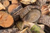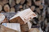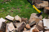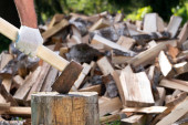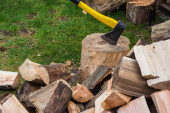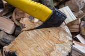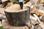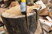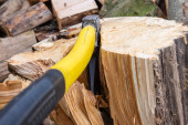 Siekiera i kikut podczas rąbania drewna na opał w pogodny dzień.