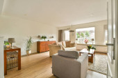Zdjęcie "Stół z krzesłami i kwiatami znajduje się w pobliżu salonu i kuchni w przestronnym pokoju współczesnego mieszkania" może być wykorzystywane do celów osobistych i komercyjnych zgodnie z warunkami zakupionej licencji Royalty-free. Obraz jest dostępny do pobrania w jakości wysokiej rozdzielczości do 5760x3840.