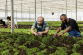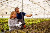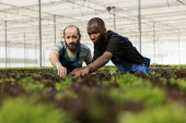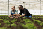 Afrykański rolnik trzymający laptopa rozmawiający z doświadczonym białym pracownikiem uczącym się o organicznych uprawach sałaty w szklarni. Organiczni pracownicy gospodarstw rolnych korzystający z komputera przenośnego do przeglądania zamówień online.