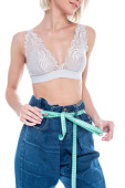 przycięty widok kobiety w dżinsach stojącej z ręką na biodrze i taśmą pomiarową odizolowanej na szaro