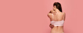 tylny widok młodej i sprawnej kobiety w bieliźnie stojącej z rękami za plecami odizolowanymi na beżu, sztandar