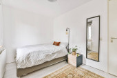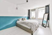 Wygodne łóżko i lampa umieszczone w małej, minimalistycznej sypialni z białymi ścianami i czarnymi zasłonami na oknie w nowoczesnym apartamencie