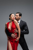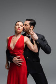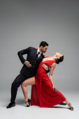 Elegancka para tańcząca tango odizolowana na szaro z przestrzenią do kopiowania