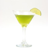 Szkło koktajlowe z limonkową zieloną słomką koktajlową i plasterkiem wapna.